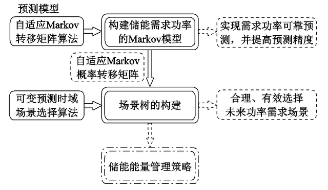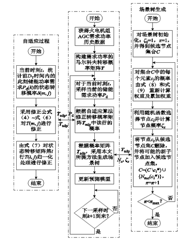 他們首先針對(duì)火電機(jī)組響應(yīng)AGC指令時(shí)功率隨機(jī)變化且難以實(shí)時(shí)監(jiān)測(cè)的問(wèn)題,采用馬爾科夫鏈建立儲(chǔ)能需求功率模型,并針對(duì)AGC指令周期性波動(dòng)的特點(diǎn),采用后驗(yàn)信息實(shí)時(shí)自適應(yīng)調(diào)整Markov轉(zhuǎn)移概率矩陣以提高預(yù)測(cè)精度。然后,針對(duì)隨機(jī)場(chǎng)景繁多的問(wèn)題,提出一種可變預(yù)測(cè)時(shí)域的場(chǎng)景樹(shù)生成方法。該方法能夠在樹(shù)節(jié)點(diǎn)規(guī)模一定的前提下更有效地選擇預(yù)測(cè)場(chǎng)景。最后,通過(guò)算例分析了所提自適應(yīng)預(yù)測(cè)模型的準(zhǔn)確性。結(jié)果表明,所提模型能夠?yàn)閮?yōu)化能量管理策略提供更有效、可靠的功率預(yù)測(cè)信息。