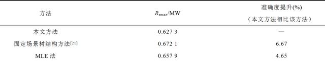 2)針對(duì)隨機(jī)性問(wèn)題場(chǎng)景繁多的問(wèn)題,提出一種可變預(yù)測(cè)時(shí)域的場(chǎng)景樹(shù)生成方法。該方法通過(guò)增加大概率場(chǎng)景的預(yù)測(cè)時(shí)域提高預(yù)測(cè)精度。同時(shí),本課題將MLE方法和加權(quán)隨機(jī)采樣法相結(jié)合,提出一種新的場(chǎng)景選擇方法,不僅最大概率場(chǎng)景容易被選擇,同時(shí)相對(duì)低概率的場(chǎng)景也能被選擇,從而提高了場(chǎng)景的預(yù)測(cè)精度。算例結(jié)果表明采用本方法所選場(chǎng)景的方均根誤差相對(duì)固定場(chǎng)景樹(shù)結(jié)構(gòu)的方法提高了6.67%,較極大似然估計(jì)法提高了4.65%。