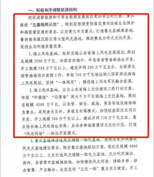 ——魯北鹽堿灘涂地風(fēng)光儲輸一體化基地.按照國家加快推進(jìn)風(fēng)光大基地建設(shè)要求,制定魯北基地規(guī)劃方案,規(guī)劃總規(guī)模4000萬千瓦以上(業(yè)主詳情可點擊鏈接查看)。立足打造風(fēng)光儲輸一體化大基地,充分利用濰坊、濱州、東營等市鹽堿灘涂地,加快推進(jìn)風(fēng)光同場、儲輸并舉、綜合智慧、產(chǎn)業(yè)融合、生態(tài)友好"五位一體"重點項目建設(shè),開工規(guī)模500萬千瓦左右,建成并網(wǎng)300萬千瓦左右。