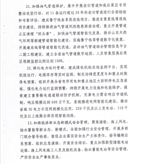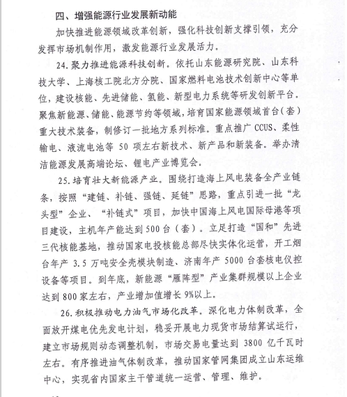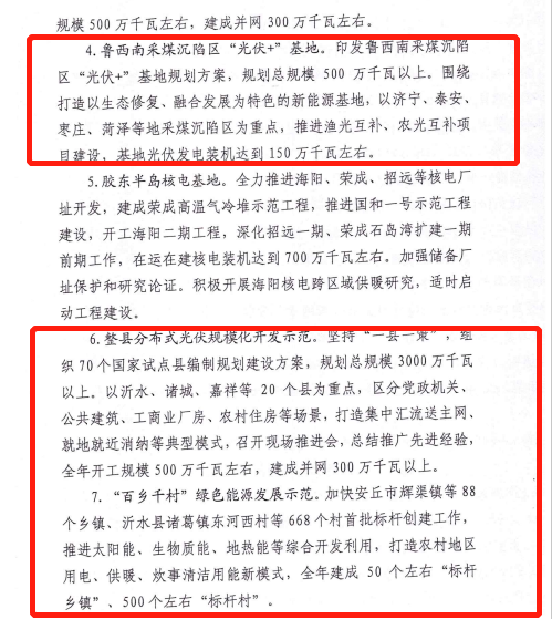 ——整縣分布式光伏規(guī)?;_發(fā)示范。堅持"一縣一策",組 織70個國家試點縣編制規(guī)劃建設(shè)方案,規(guī)劃總規(guī)模3000萬千瓦以上。以沂水、諸城、嘉祥等20個縣為重點,區(qū)分黨政機(jī)關(guān)、公共建筑、工商業(yè)廠房、農(nóng)村住房等場景,打造集中匯流送主網(wǎng)、就地就近消納等典型模式,召開現(xiàn)場推進(jìn)會,總結(jié)推廣先進(jìn)經(jīng)驗, 全年開工規(guī)模500萬千瓦左右,建成并網(wǎng)300萬千瓦以上。