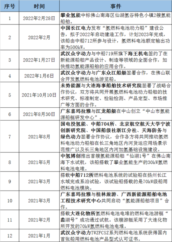 從布局的企業(yè)來看,以國(guó)電投氫能、未勢(shì)能源、武漢眾宇動(dòng)力、廣東喜瑪拉雅為代表的燃料電池企業(yè)開始將眼光投向氫能船舶;以廣東眾江船艇、江龍船艇為代表的船舶企業(yè)正聚焦氫能以實(shí)現(xiàn)船舶行業(yè)的綠色轉(zhuǎn)型。