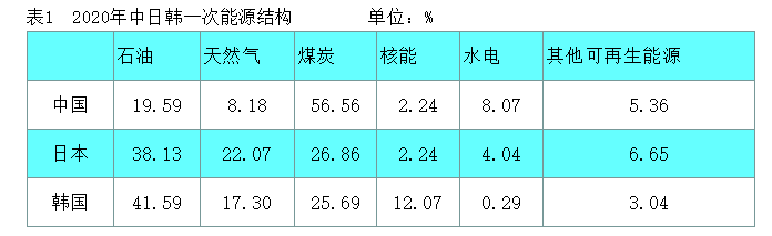 從當(dāng)前碳排放看,中國(guó)、日本、韓國(guó)碳排放量分別位居全球第一、第五和第八位。據(jù)BP能源統(tǒng)計(jì)年鑒數(shù)據(jù),2020年,日本、韓國(guó)能源領(lǐng)域碳排放量分別占全球碳排放總量的3.2%和1.8%,而中國(guó)這一占比則高達(dá)30.9%,雖然日本和韓國(guó)絕對(duì)碳排放量遠(yuǎn)低于中國(guó)(見(jiàn)圖1),但受制于高碳化石能源結(jié)構(gòu),日本和韓國(guó)實(shí)現(xiàn)碳中和的減排難度同樣不小。從一次能源結(jié)構(gòu)看(見(jiàn)表1),中、日、韓三國(guó)化石能源在一次能源消費(fèi)中的占比均超過(guò)80%,不同的是,中國(guó)一次能源消費(fèi)中以煤炭為主,日本和韓國(guó)則以油氣為主。此外,在一次能源消費(fèi)結(jié)構(gòu)中,中國(guó)的水電和非水可再生能源占比最高,韓國(guó)的可再生能源占比不足5%,在中、日、韓三國(guó)中之一指標(biāo)占比最低。綜合來(lái)看,碳中和背景下,中、日、韓共同面臨高碳化石能源減量替代、大力推進(jìn)非化石能源尤其是可再生能源發(fā)展的現(xiàn)實(shí)訴求,能源轉(zhuǎn)型的共性需求牽引為中、日、韓加強(qiáng)能源合作迎來(lái)新的契機(jī)。