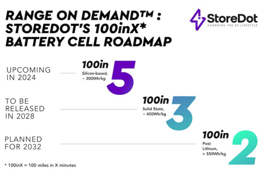 近日,以色列電池生產(chǎn)商StoreDot近日對外展示了其技術(shù)路線圖"100inX"。該公司計劃在未來10年內(nèi),開發(fā)出充電兩分鐘續(xù)航100英里(160公里)的電池。預(yù)計到2024年,StoreDot目前正在開發(fā)中的(未來或與EVE合作批量生產(chǎn)的)電池,可以實現(xiàn)充電五分鐘續(xù)航100英里(160公里)。