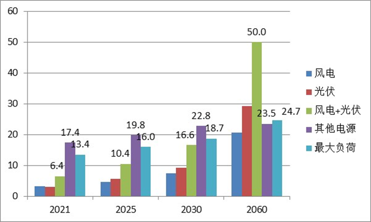 圖2 既有情景我國(guó)電源結(jié)構(gòu)及最大負(fù)荷預(yù)測(cè)