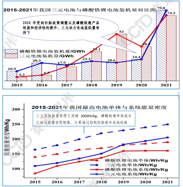 我國動(dòng)力電池裝機(jī)單體和系統(tǒng)能量密度持續(xù)提升。目前形成了兩種技術(shù)共同主導(dǎo)動(dòng)力電池市場的局面。補(bǔ)貼政策效用和技術(shù)進(jìn)步等多因素驅(qū)動(dòng)下,三元?jiǎng)恿﹄姵睾驮搅姿徼F鋰電池裝機(jī)量呈現(xiàn)交替上升趨勢