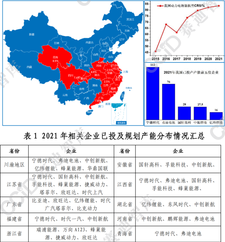 我國動(dòng)力電池產(chǎn)業(yè)集中度快速提升。依托市場和資源稟賦,電池企業(yè)主要分布在東南沿海、華中以及川渝地區(qū),區(qū)域集群顯著。電池產(chǎn)能亦呈現(xiàn)較高集中度,TOP5頭部效應(yīng)明顯