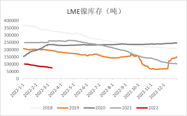 Wind數(shù)據(jù)顯示,2021年3月1日,倫敦金屬交易所鎳庫存為25.06萬噸。而截至2022年3月11日,庫存已降至7.57萬噸??梢钥闯觯瑤齑姹淮罅肯?。高承君認(rèn)為,鎳庫存下降,很大一部分原因在于鎳豆被消耗了。