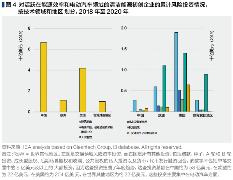 對(duì)能源效率和電動(dòng)出行初創(chuàng)企業(yè)的風(fēng)險(xiǎn)投資集中在世界幾個(gè)地方。在2018-2020年期間,總部設(shè)在美國的公司吸引了約40%的此類融資,其次是中國(30%)和歐盟(10%)(不包括單輪5億美元或以上的大型交易,因?yàn)檫@些交易可能掩蓋基本趨勢(shì))。在中國和美國,圍繞交通領(lǐng)域電動(dòng)化的投資活動(dòng)十分活躍,中國從2015年左右開始受益于有針對(duì)性的支持,美國則有一系列超過10億美元的交易記錄。相比之下,建筑、電力和工業(yè)在全球范圍內(nèi)吸引的能效風(fēng)險(xiǎn)投資要少得多,而且在這些部門實(shí)現(xiàn)凈零排放的目標(biāo)方面還有許多技術(shù)創(chuàng)新的差距和機(jī)會(huì)。