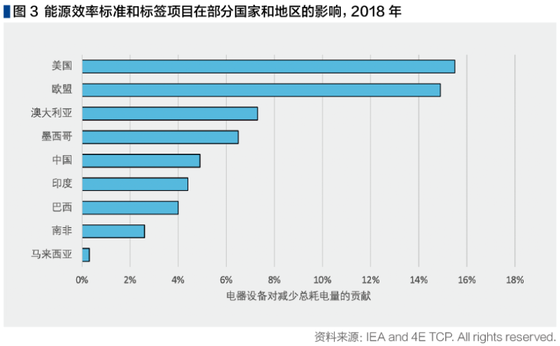 在有數(shù)據(jù)可查的九個(gè)國家和地區(qū)中,效率標(biāo)準(zhǔn)和標(biāo)簽減少的電力需求量,相當(dāng)于風(fēng)能和太陽能的總發(fā)電量。這些標(biāo)準(zhǔn)在歐盟和美國實(shí)施的時(shí)間更長(zhǎng),但中國正在迎頭趕上。在中國,標(biāo)準(zhǔn)的實(shí)施已經(jīng)幫助每年避免了全國總電力消耗的5%左右,每年減少 8000萬噸的二氧化碳排放。隨著舊設(shè)備被更高效的設(shè)備所取代,這些節(jié)約將越來越多,盡管標(biāo)準(zhǔn)需要不斷提高以優(yōu)化節(jié)能。