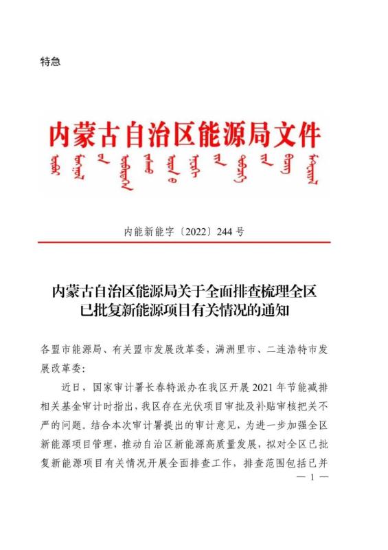 中國(guó)儲(chǔ)能網(wǎng)訊:3月9日,內(nèi)蒙古自治區(qū)能源局發(fā)布特急文件《關(guān)于全面排查梳理全區(qū)已批復(fù)新能源項(xiàng)目有關(guān)情況的通知》(內(nèi)能新能字(2022)244號(hào)),通知指出: