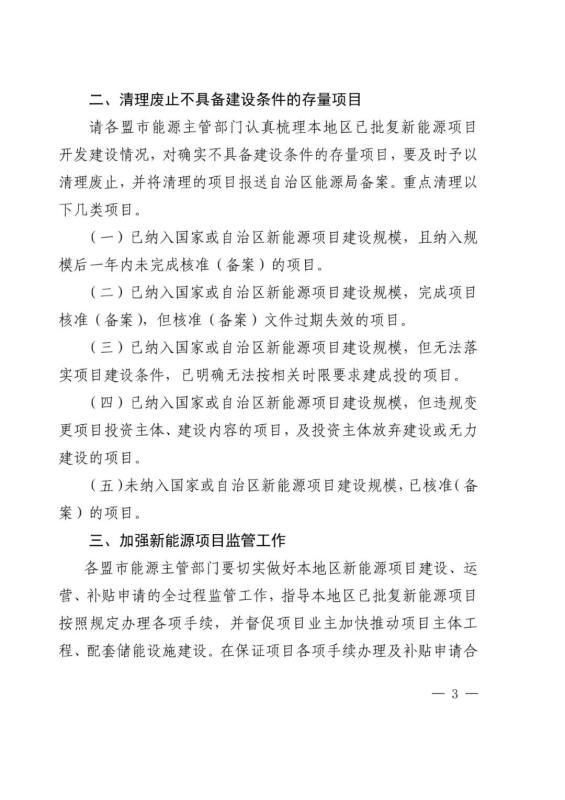 已納入國(guó)家或自治區(qū)新能源項(xiàng)目建設(shè)規(guī)模,且納入規(guī)模后一年內(nèi)未完成核準(zhǔn)(備案)的項(xiàng)目;完成項(xiàng)目核準(zhǔn)(備案),但核準(zhǔn)(備案)文件過(guò)期失效的項(xiàng)目;無(wú)法落實(shí)項(xiàng)目建設(shè)條件,已明確無(wú)法按相關(guān)時(shí)限要求建成投的項(xiàng)目;違規(guī)變更項(xiàng)目投資主體、建設(shè)內(nèi)容的項(xiàng)目,及投資主體放棄建設(shè)或無(wú)力建設(shè)的項(xiàng)目。