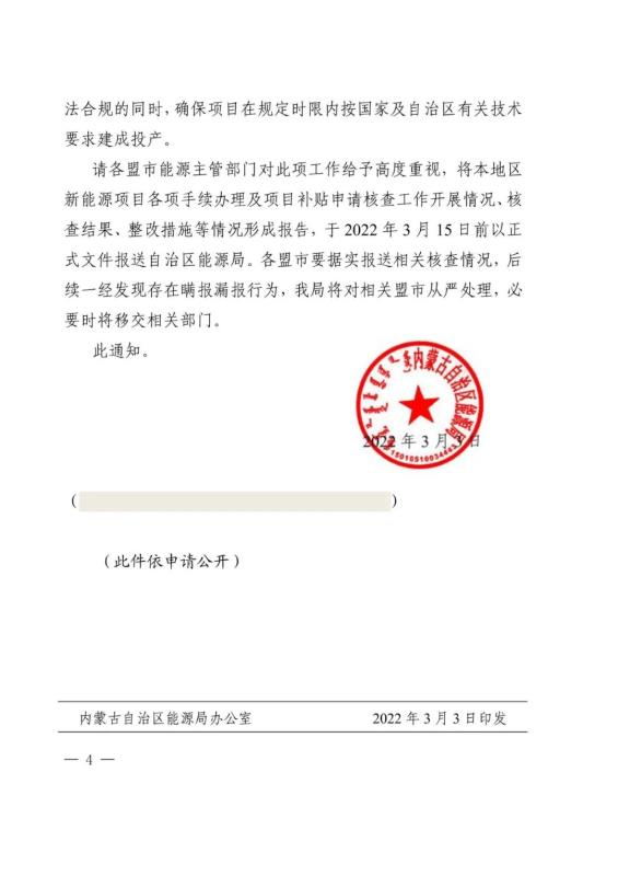 請(qǐng)各盟市能源主管部門(mén)對(duì)此項(xiàng)工作給予高度重視,將本地區(qū)新能源項(xiàng)目各項(xiàng)手續(xù)辦理及項(xiàng)目補(bǔ)貼申請(qǐng)核查工作開(kāi)展情況、核 查結(jié)果、整改措施等情況形成報(bào)告,于2022年3月15日前以正式文件報(bào)送自治區(qū)能源局。各盟市要據(jù)實(shí)報(bào)送相關(guān)核查情況,后續(xù)一經(jīng)發(fā)現(xiàn)存在瞞報(bào)漏報(bào)行為,我局將對(duì)相關(guān)盟市從嚴(yán)處理,必要時(shí)將移交相關(guān)部門(mén)。