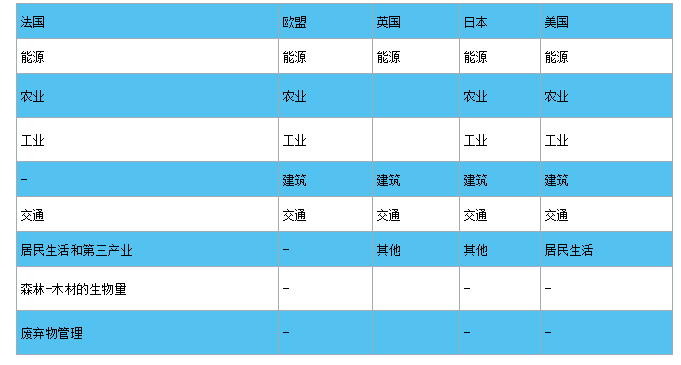 歐盟、法國(guó)、美國(guó)、日本的碳中和實(shí)現(xiàn)路徑涉及的主要領(lǐng)域分類如下:
