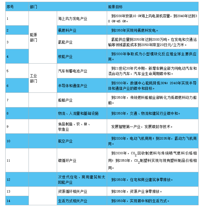 圖5 日本碳中和對(duì)14個(gè)產(chǎn)業(yè)的相關(guān)計(jì)劃。