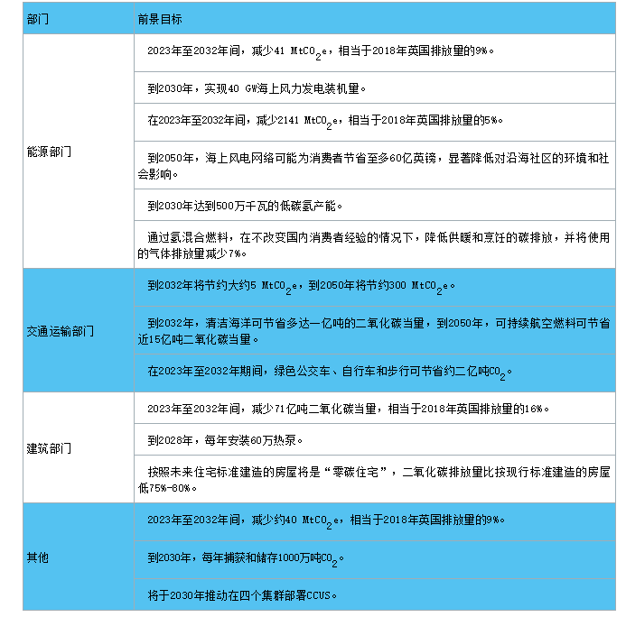 為支撐上述目標(biāo)實(shí)現(xiàn),英國(guó)配套了以下政策措施,主要有:一是在能源方面,配套2.4億英鎊的凈零氫基金,投入最高3.85億英鎊的先進(jìn)核基金;二是在交通方面,到2030年停止銷售新的汽油和柴油汽車和貨車,并要求銷售的新車中至少50%的乘用車和40%的貨車必須實(shí)現(xiàn)超低排放,從2035年起達(dá)到100%零排放;三是在交通運(yùn)輸方面,英國(guó)將投資42億英鎊用于城市公共交通,50億英鎊用于公共汽車、自行車和步行,投資1500萬(wàn)英鎊支持可持續(xù)航空燃料(SAF)的生產(chǎn);四是在建筑方面,實(shí)施“未來家居標(biāo)準(zhǔn)”;五是投入10億英鎊成立CCUS基礎(chǔ)設(shè)施基金。