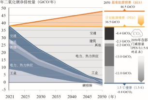 注:圖中藍(lán)色陰影區(qū)域表示1.5-S中相應(yīng)部門的剩余凈CO2排放量,灰色區(qū)域表示1.5-S中相對(duì)于PES的CO2排放減少量。工業(yè)包括與能源和過程相關(guān)的二氧化碳排放?!捌渌卑ǚ悄茉词褂煤娃r(nóng)業(yè)、林業(yè)等其他部門的排放。工業(yè)、電力和熱電廠的排放包括通過碳捕獲、BECCS和其他碳去除措施捕獲的二氧化碳排放。到2050年,工業(yè)和電力熱力供應(yīng)部門的排放變成凈負(fù)值??傮w而言,2050年1.5-S情境下,二氧化碳凈排放量將達(dá)到-0.4 Gt。
