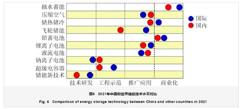 圖6給出了2021年中國和世界儲能技術水平對比。從圖中可見,經(jīng)過“十二五”和“十三五”期間國家和產(chǎn)業(yè)的持續(xù)投入,中國儲能技術的水平快速提升,壓縮空氣儲能、儲熱儲冷、鉛蓄電池、鋰離子電池、液流電池和鈉離子電池技術已達到或接近世界先進水平;抽水蓄能、飛輪儲能、超級電容器和儲能新技術和世界先進水平還有一定的差距,但總體上差距在逐步縮小。