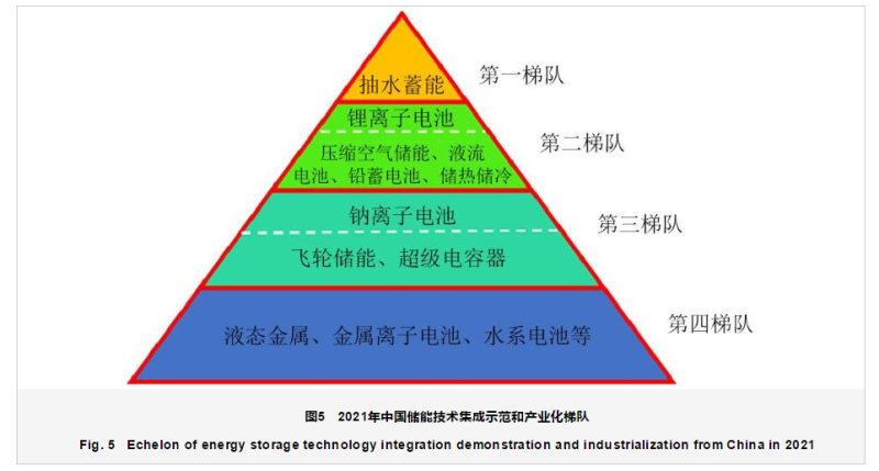 如圖5所示,綜合分析各儲能技術2021年的新增裝機容量,各種儲能技術大致可以分為四個梯隊。第一梯隊為抽水蓄能,單機規(guī)模100 MW以上,占2021年全國儲能新增裝機的79%左右;第二梯隊為鋰離子電池、壓縮空氣儲能、液流電池、鉛蓄電池和儲熱儲冷技術,單機規(guī)??蛇_10~100 MW,其中鋰離子電池新增裝機達到18%,未來有可能形成單獨的一個梯隊;第三梯隊為鈉離子電池、飛輪儲能和超級電容器,目前單機規(guī)??梢赃_到MW級,其中鈉離子發(fā)展受關注最多,經(jīng)過一段時間的發(fā)展有可能未來進入第二梯隊;第四梯隊為液態(tài)金屬、金屬離子電池和水系電池等新型儲能技術,需要進一步的研發(fā),以盡早實現(xiàn)集成示范和產(chǎn)業(yè)化應用。