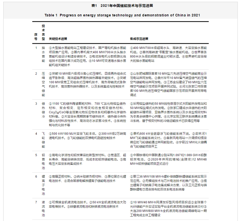 表1給出了2021年中國儲能關鍵技術進展的總結(jié)。從表中可見,2021年我國主要儲能技術研發(fā)均取得了重要進展,綜合分析大致可以分為三類。