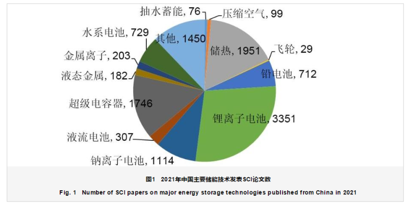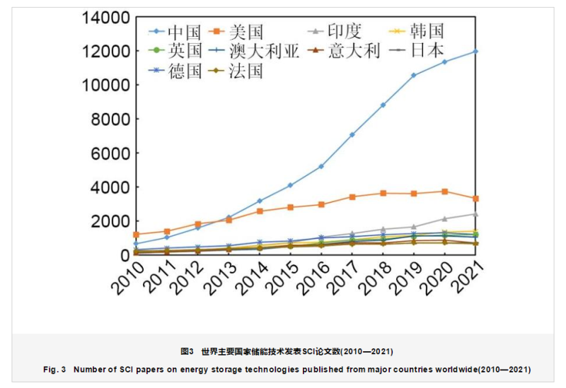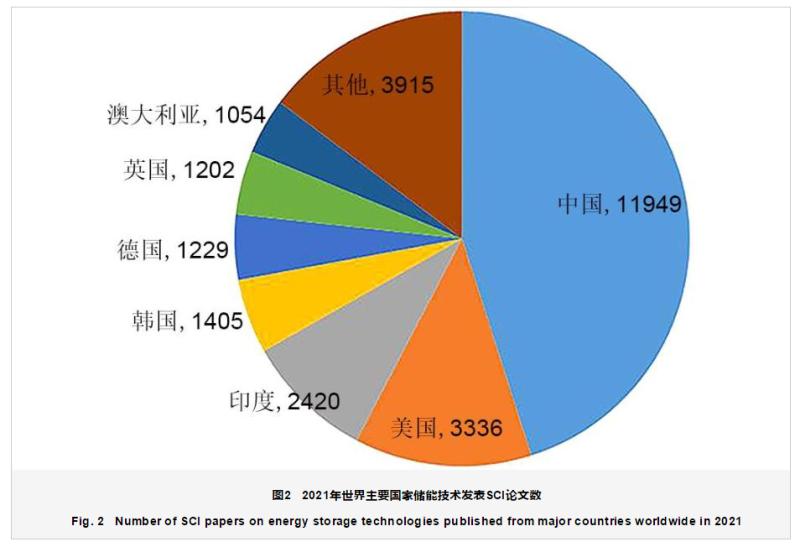 2021年,中國儲能技術在基礎研究、關鍵技術和集成示范方面均取得了重要進展。這一年,中國機構(gòu)和學者發(fā)表SCI論文11949篇,居世界第一位,且遙遙領先于第二位美國,中國已經(jīng)成為全球儲能技術基礎研究最活躍的國家。在關鍵技術和集成示范方面,各主要儲能技術也均取得重要進展,中國已成為世界儲能技術研發(fā)和示范的主要核心國家之一。
