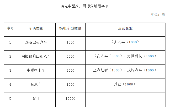 2.網絡預約出租汽車應用領域。中心城區(qū)和區(qū)縣新增和更新網約車優(yōu)先使用換電新能源汽車,實行網約車數(shù)量調整的區(qū)縣,在新增投放網約車中,優(yōu)先向在使用換電新能源網約車的車輛所有人投放;支持整車企業(yè)與運營企業(yè)、出行企業(yè)等開展合資合作,全面加快網絡預約出租汽車電動化替代。(責任單位:市交通局,區(qū)縣政府)