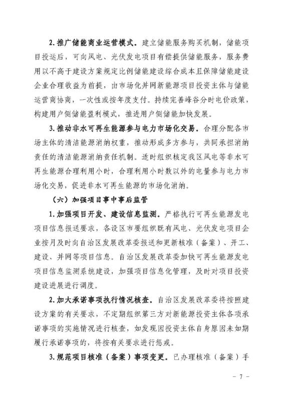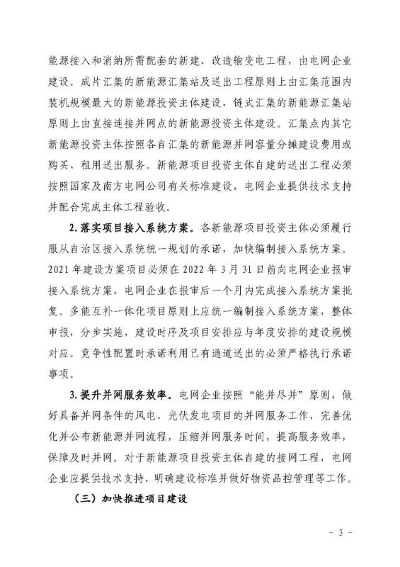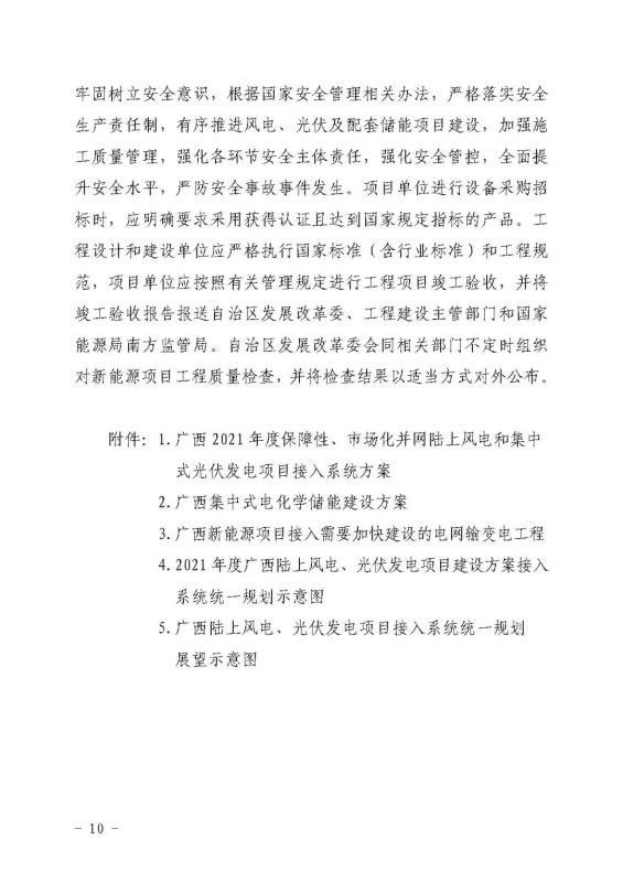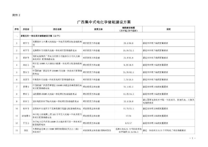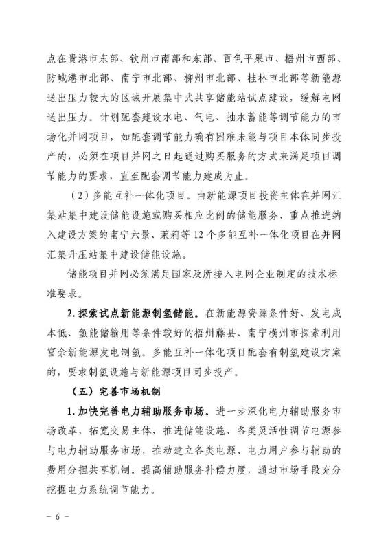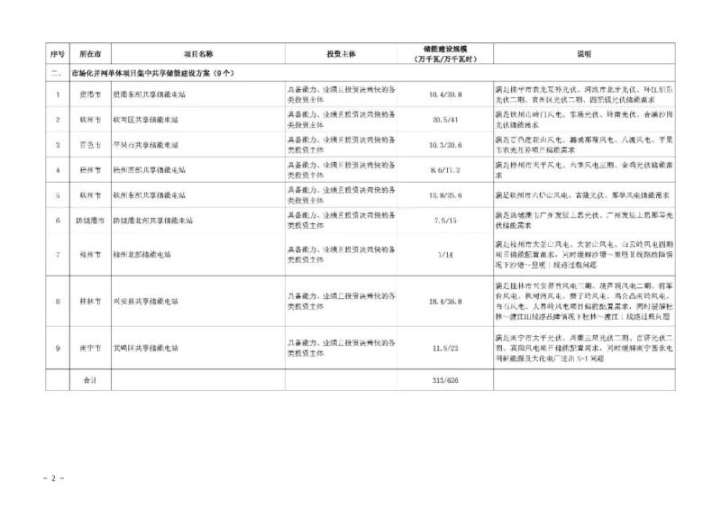 須按照要求配置相應(yīng)的調(diào)節(jié)能力或購買相應(yīng)比例的儲(chǔ)能服務(wù),并與項(xiàng)目本體同步建成投產(chǎn)或在項(xiàng)目并網(wǎng)前完成服務(wù)協(xié)議簽訂。鼓勵(lì)電網(wǎng)企業(yè)及有實(shí)力的新能源投資企業(yè)在系統(tǒng)需要的區(qū)域建設(shè)集中共享儲(chǔ)能設(shè)施,重點(diǎn)在貴港市東部、欽州市南部和東部、百色平果市、梧州市西部、防城港市北部、南寧市北部、柳州市北部、桂林市北部等新能源送出壓力較大的區(qū)域開展集中式共享儲(chǔ)能站試點(diǎn)建設(shè),緩解電網(wǎng) 送出壓力。計(jì)劃配套建設(shè)水電、氣電、抽水蓄能等調(diào)節(jié)能力的市場(chǎng)化并網(wǎng)項(xiàng)目,如配套調(diào)節(jié)能力確有困難未能與項(xiàng)目本體同步投產(chǎn)的,必須在項(xiàng)目并網(wǎng)之日起通過購買服務(wù)的方式來滿足項(xiàng)目調(diào)節(jié)能力的要求,直至配套調(diào)節(jié)能力建成為止。