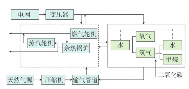 燃?xì)鉄犭娐?lián)產(chǎn)自備電廠和天然氣廠的結(jié)合可以共享彼此的產(chǎn)品,有效地促進(jìn)區(qū)域內(nèi)能源的協(xié)調(diào)利用,減少環(huán)境污染,并促進(jìn)煤改電政策的實(shí)施。當(dāng)自備電廠的發(fā)電供給大于需求時,多余的電力被發(fā)送到天然氣廠生產(chǎn)天然氣,天然氣被通過管網(wǎng)輸送到儲存罐存儲。當(dāng)電力需求大于供給時,天然氣被直接輸送到自備電廠的燃?xì)廨啓C(jī),作為能源驅(qū)動燃?xì)廨啓C(jī)生產(chǎn)電能和熱能。