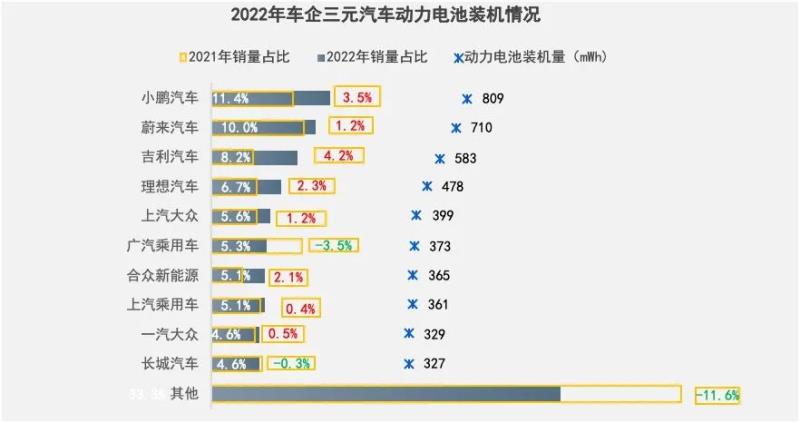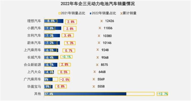 很明顯可以看到,比亞迪、特斯拉(國內(nèi)市場)和上汽通用五菱幾乎退出了三元動力電池車型的布局,新勢力理想、小鵬、蔚來和哪吒,吉利、上汽乘用等傳統(tǒng)車企,南北大眾、華晨寶馬等合資品牌,是目前三元新能源汽車的主力軍。