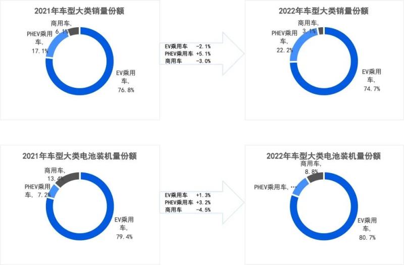 不管從什么層級看,2021年單車帶電量均呈現(xiàn)上升趨勢,最主要的原因在于動力電池性能提升。也是在2021年,純電乘用車平均單車帶電量反超新能源乘用車平均單車帶電量,究其原因還是因為新能源商用車銷量份額的進一步。