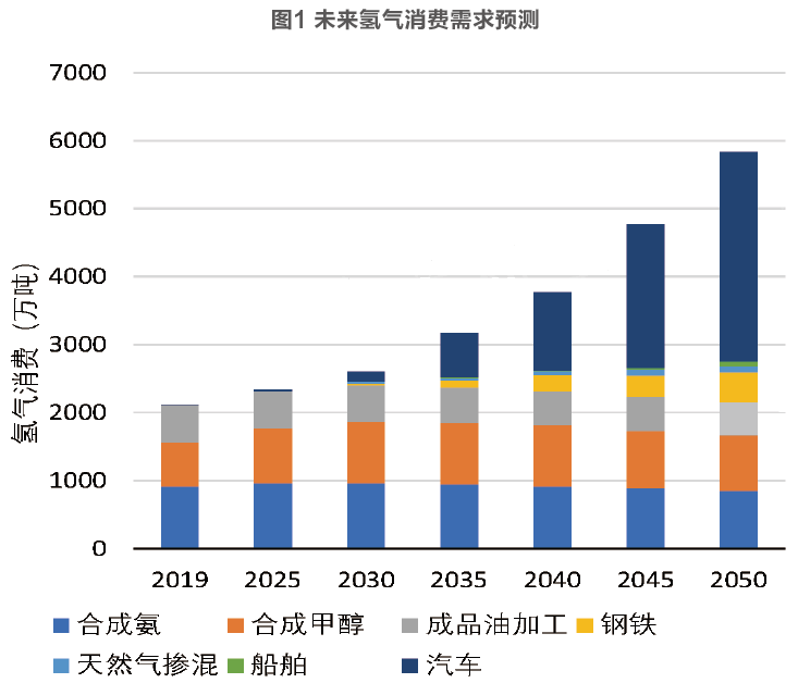 據(jù)中國氫能聯(lián)盟預(yù)計(jì),到2030年中國氫氣需求量將達(dá)到3500萬噸,在終端能源體系中占比5%,主要增量來自交通運(yùn)輸?shù)娜剂想姵剀?,產(chǎn)能缺口約1000萬噸/年;到2050年氫能將在中國終端能源體系中占比至少達(dá)到10%,氫氣需求量接近6000萬噸,其中交通運(yùn)輸領(lǐng)域用氫2458萬噸,工業(yè)領(lǐng)域3370萬噸,其他領(lǐng)域110萬噸,產(chǎn)業(yè)鏈年產(chǎn)值約12萬億元,產(chǎn)能缺口約3500萬噸/年。