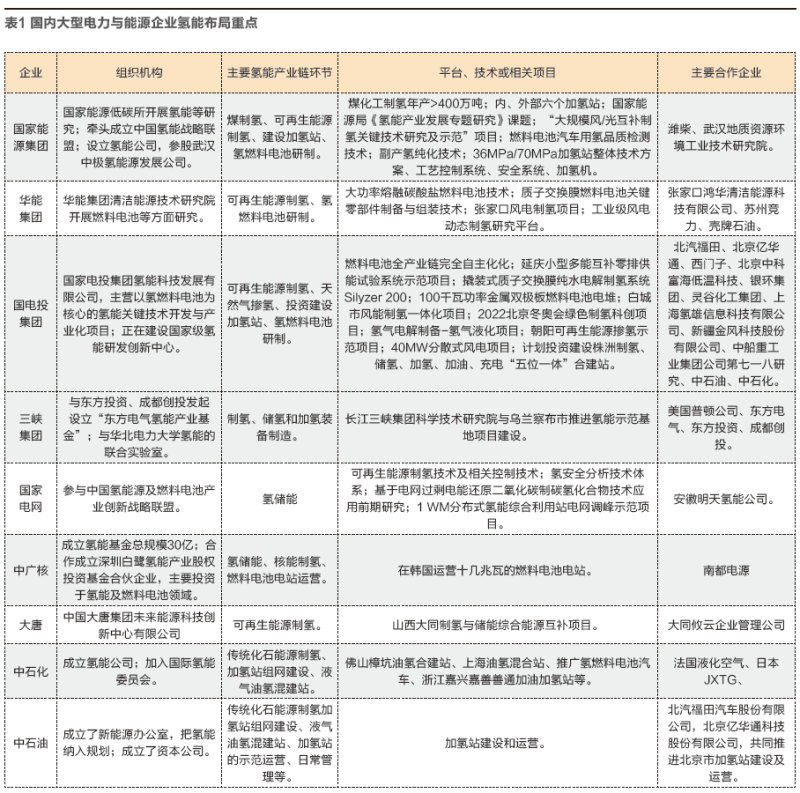 當(dāng)前我國氫能發(fā)展處于初期,各大央企從氫能基礎(chǔ)設(shè)施建設(shè)、關(guān)鍵技術(shù)研發(fā)、產(chǎn)品推廣應(yīng)用等場景積極布局。據(jù)香橙會(huì)研究院統(tǒng)計(jì),2019年國務(wù)院國資委監(jiān)管的96家央企中,開展氫能相關(guān)業(yè)務(wù)或布局的中央企業(yè)有26家,數(shù)量占比高達(dá)27%,涉及的氫能產(chǎn)業(yè)鏈側(cè)重于制氫、氫燃料電池研發(fā)以及加氫站建設(shè)。從氫能產(chǎn)業(yè)相關(guān)布局來看,各大企業(yè)分別從組織機(jī)構(gòu)、核心關(guān)鍵零部件技術(shù)、示范工程項(xiàng)目等方面開展相關(guān)工作,詳情見表1。