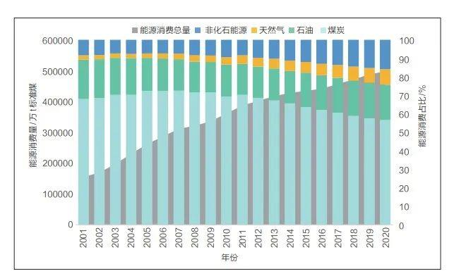 圖4 中國(guó)能源消費(fèi)走勢(shì)及能源結(jié)構(gòu)占比(2001-2020年)