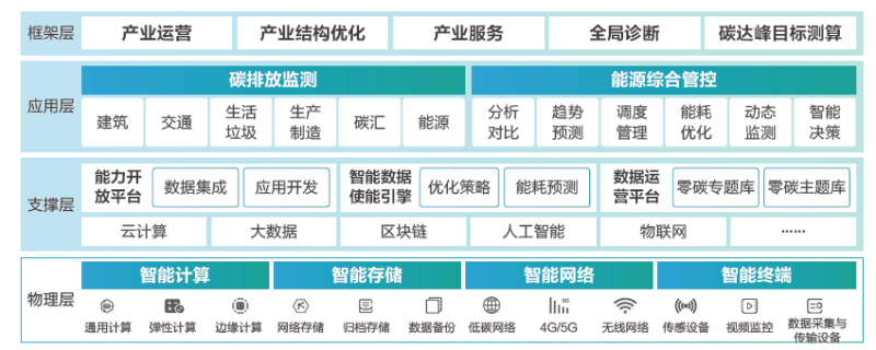 3. 零碳操作系統(tǒng)。以數(shù)據(jù)為核心生產(chǎn)要素,通過(guò)框架層、應(yīng)用層、支撐層和物理層共同支撐零碳智慧園區(qū)建設(shè),為零碳生產(chǎn)、零碳建筑、零碳交通等各類場(chǎng)景化應(yīng)用提供通用的、可復(fù)制性的基礎(chǔ)能力支撐,促進(jìn)園區(qū)基于此操作系統(tǒng)開(kāi)發(fā)碳排放、碳清潔能源等相關(guān)智慧應(yīng)用,同時(shí)數(shù)字化賦能園區(qū)碳生命周期全程智慧監(jiān)測(cè)與管理,實(shí)現(xiàn)園區(qū)內(nèi)部管理者、經(jīng)營(yíng)者和消費(fèi)者的全聯(lián)接,從過(guò)程和終端兩方面共同幫助園區(qū)實(shí)現(xiàn)零碳目標(biāo)。
