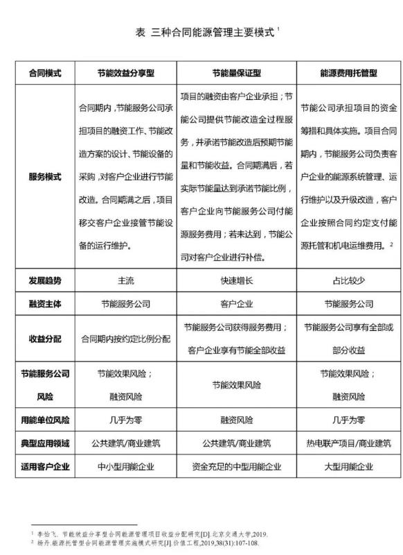 其中,能源績(jī)效合同管理是當(dāng)前國(guó)內(nèi)的主流能源管理模式,共分為節(jié)能效益分享型、節(jié)能量保證型和能源費(fèi)用托管型合同管理模式。