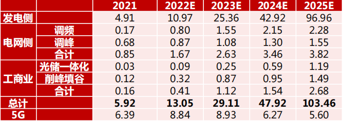 綜合來看,預(yù)計(jì)2022-2025年儲(chǔ)能新增裝機(jī)量(除5G應(yīng)用外)分別為13.05、29.11、47.92、103.46GWh。新增裝機(jī)量的21-25年年復(fù)合增長率約104.5%。