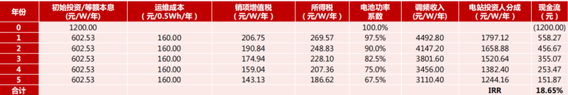 則當(dāng)儲(chǔ)能電站各項(xiàng)參數(shù)均處于行業(yè)領(lǐng)先的水平時(shí),預(yù)計(jì)調(diào)頻之后所產(chǎn)生的內(nèi)部收益率約18.65%。