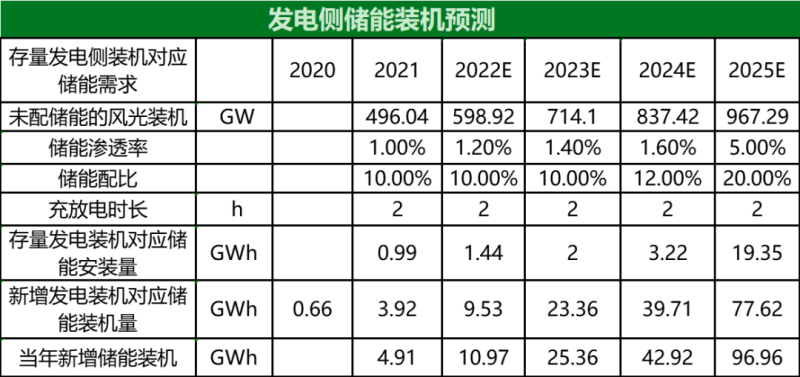 民生證券預(yù)測,2021-2025,儲(chǔ)能裝機(jī)年復(fù)合增長率將達(dá)到110.8%。國內(nèi)發(fā)電側(cè)儲(chǔ)能裝機(jī)高增原因在于:風(fēng)光裝機(jī)高增速;儲(chǔ)能滲透率及儲(chǔ)能配比的持續(xù)提升;存量風(fēng)光電站也在參與配儲(chǔ)。