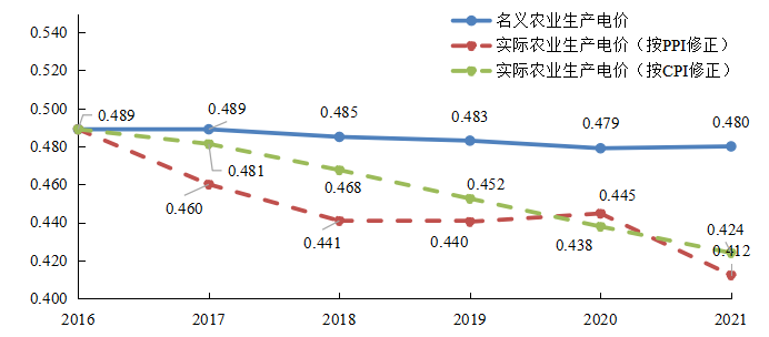 圖5 農(nóng)業(yè)生產(chǎn)電價(jià)名義與實(shí)際變化趨勢圖