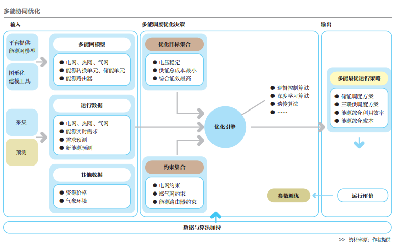 以新型電力系統(tǒng)的一個(gè)重要組成部分——末端的區(qū)域綜合能源智能化為例,區(qū)域綜合能源系統(tǒng)是一個(gè)復(fù)雜的系統(tǒng),供能側(cè)既有大電網(wǎng)供電,又有多種分布式能源、儲(chǔ)能,電、熱、冷、燃?xì)?、壓縮空氣儲(chǔ)能等多種能源工質(zhì)混雜;用能側(cè)既要求安全、穩(wěn)定、持續(xù)供能,又要求能夠智慧用能,經(jīng)濟(jì)高效地對(duì)企業(yè)生產(chǎn)波動(dòng)、能源市場(chǎng)波動(dòng)、能源系統(tǒng)波動(dòng)進(jìn)行快速響應(yīng),實(shí)現(xiàn)能源利用效率最大化。在這種情況下,區(qū)域綜合能源平衡相對(duì)于傳統(tǒng)的配電網(wǎng)電力電量平衡,復(fù)雜程度要上升好幾個(gè)數(shù)量級(jí)。單純依靠傳統(tǒng)的能源技術(shù)、電力電子與自控技術(shù),已經(jīng)很難實(shí)現(xiàn)整體上的平衡和優(yōu)化,必須依靠數(shù)字化技術(shù),利用數(shù)字技術(shù)與能源技術(shù)包括自控技術(shù)的深度融合,實(shí)現(xiàn)區(qū)域能源系統(tǒng)的“安穩(wěn)長(zhǎng)滿優(yōu)”運(yùn)行。