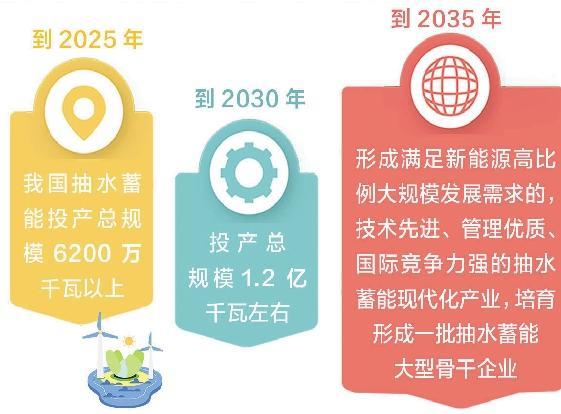 《規(guī)劃》要求加快抽水蓄能電站核準建設,各?。▍^(qū)、市)能源主管部門根據(jù)中長期規(guī)劃,結合本地區(qū)實際情況,統(tǒng)籌電力系統(tǒng)需求、新能源發(fā)展等,按照能核盡核、能開盡開的原則,在規(guī)劃重點實施項目庫內(nèi)核準建設抽水蓄能電站。到2025年,抽水蓄能投產(chǎn)總規(guī)模較“十三五”翻一番,達到6200萬千瓦以上;到2030年,抽水蓄能投產(chǎn)總規(guī)模較“十四五”再翻一番,達到1.2億千瓦左右;到2035年,形成滿足新能源高比例大規(guī)模發(fā)展需求的,技術先進、管理優(yōu)質(zhì)、國際競爭力強的抽水蓄能現(xiàn)代化產(chǎn)業(yè),培育形成一批抽水蓄能大型骨干企業(yè)。