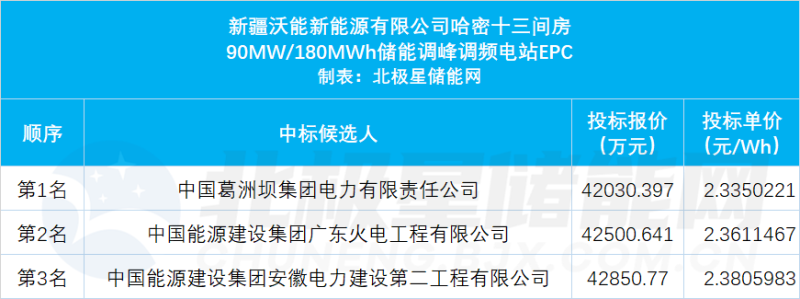 根據(jù)中標(biāo)公示,第一中標(biāo)候選人葛洲壩集團(tuán)、投標(biāo)報(bào)價(jià)4.2億元,單價(jià)約2.335元/Wh。第二中標(biāo)候選人中國能建集團(tuán)廣東火電工程有限公司、投標(biāo)報(bào)價(jià)4.25億元,單價(jià)約2.36元/Wh。第三中標(biāo)候選人中國能建集團(tuán)安徽電力建設(shè)第二工程有限公司、投標(biāo)報(bào)價(jià)4.285億元,單價(jià)約2.38元/Wh。