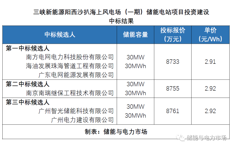 中國(guó)儲(chǔ)能網(wǎng)訊:近日,三峽新能源新能源陽(yáng)西沙扒海上風(fēng)電場(chǎng)(一期)儲(chǔ)能電站項(xiàng)目發(fā)布投資建設(shè)中標(biāo)結(jié)果,南方電網(wǎng)科技股份有限公司/海油發(fā)展珠海管道工程有限公司/廣東電網(wǎng)能源發(fā)展有限公司組成的聯(lián)合體成為第一中標(biāo)候選人,投標(biāo)報(bào)價(jià)8733萬(wàn)元,該項(xiàng)目?jī)?chǔ)能容量30MW/30MWh,中標(biāo)單價(jià)2.91元/Wh。