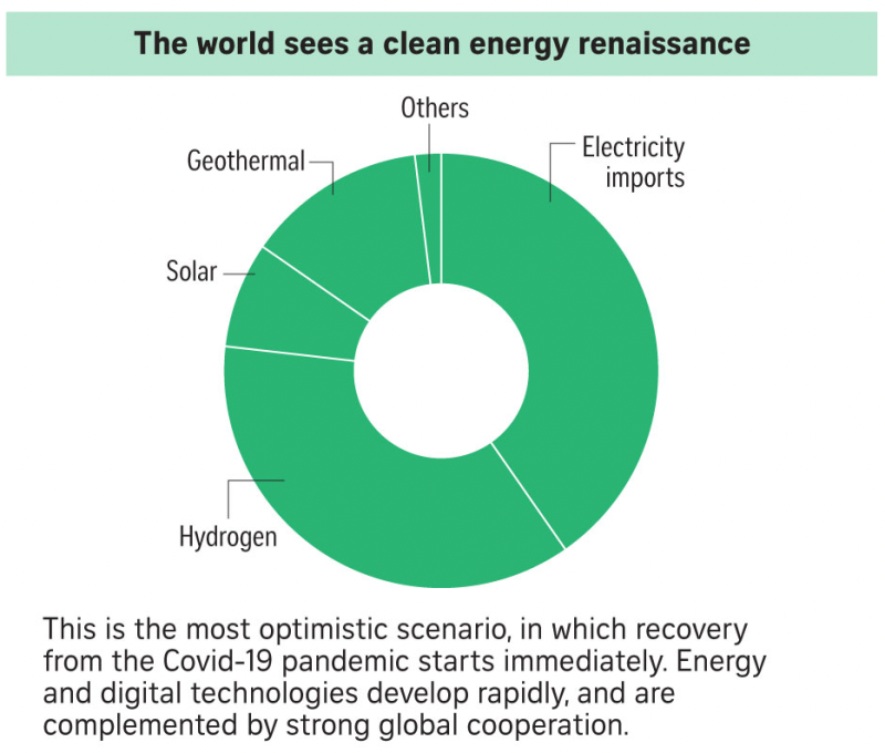 在最樂觀的情況下,能源和數(shù)字技術(shù)發(fā)展迅速,并輔之以強(qiáng)有力的全球合作。這使新加坡能夠在2050年實(shí)現(xiàn)多樣化的能源供應(yīng)組合,有能力從多個國家進(jìn)口能源,并將低碳?xì)溆米麝P(guān)鍵能源。第二種情況假設(shè)COVID-19復(fù)蘇的路徑更長,推遲投資到清潔能源技術(shù),導(dǎo)致新的發(fā)展停滯。在這種情況下,天然氣仍然是新加坡能源結(jié)構(gòu)的重要組成部分,排放量通過從其他地方購買碳信用額度來抵消。