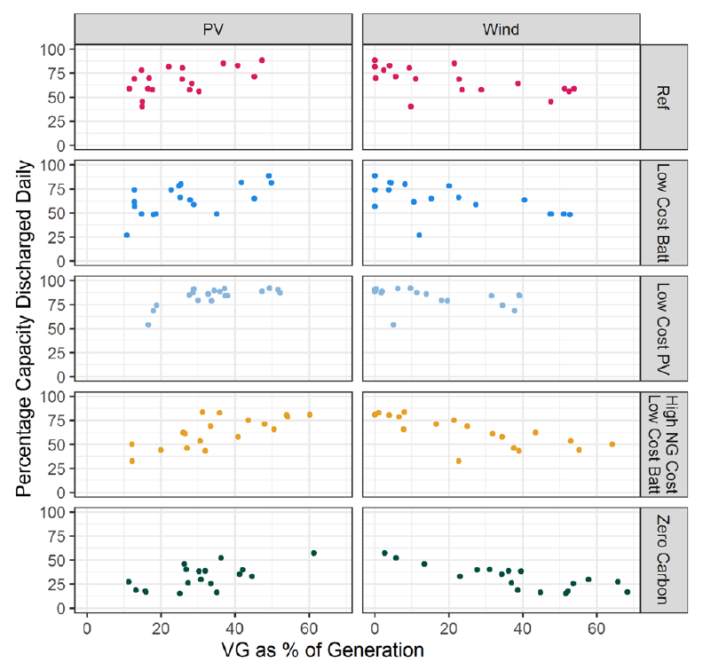 最后,報告研究了2050年高天然氣成本/低成本電池場景中每日排放的儲能容量百分比與可變發(fā)電量貢獻(xiàn)之間的關(guān)系(如圖5所示)。在這里,將區(qū)域能源部署系統(tǒng)(ReEDS)區(qū)域的集合繪制為一個點;這樣做將足跡劃分為美國18個區(qū)域,在某種程度上接近區(qū)域輸電組織/獨(dú)立系統(tǒng)運(yùn)營商的足跡或市場區(qū)域。每個區(qū)域都是一個點,每日放電容量的百分比與太陽能發(fā)電占總發(fā)電量的百分比(左圖)或風(fēng)力發(fā)電占總發(fā)電量的百分比(右圖)。盡管該圖表現(xiàn)出很大的變化,但太陽能發(fā)電量增加與每日放電容量百分比(或每日能量循環(huán))增加之間存在明顯關(guān)系,而風(fēng)力發(fā)電量增加與每日放電容量百分比減少之間存在明顯關(guān)系。太陽能發(fā)電的正相關(guān)關(guān)系表明,隨著太陽能發(fā)電量的增加,對儲能系統(tǒng)的需求增加——儲能系統(tǒng)在白天可以利采用太陽能發(fā)電設(shè)施過量電力進(jìn)行充電,并在早晚的峰值期期放電。另一方面,也看到風(fēng)力發(fā)電的相反關(guān)系。先前的分析表明,風(fēng)力發(fā)電設(shè)施的過量發(fā)電通常會持續(xù)數(shù)小時甚至數(shù)天的時間,遠(yuǎn)遠(yuǎn)超過該研究中部署的儲能系統(tǒng)的持續(xù)時間。在這些風(fēng)力發(fā)電過剩期間,儲能系統(tǒng)充滿電之后而無需放電,直到過發(fā)電期間停止,從而降低了平均日使用容量。