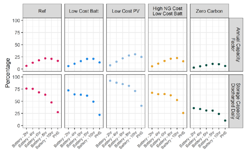 為了回答這些問題,這項工作評估了區(qū)域能源部署系統(tǒng)(ReEDS)模型確定的場景的詳細(xì)操作,以使用商業(yè)生產(chǎn)成本模型軟件PLEXOS以每小時為基礎(chǔ)來明確實現(xiàn)儲能部署率較高的場景的操作。該研究使用一系列場景來評估儲能系統(tǒng)在每日、季節(jié)性和年度基礎(chǔ)上可能扮演的角色,以及該角色如何隨著儲能系統(tǒng)的配置和系統(tǒng)資源組合而變化。(注:PLEXOS是采用基于數(shù)學(xué)原理的優(yōu)化技術(shù)進(jìn)行預(yù)測的經(jīng)濟(jì)型優(yōu)化軟件。PLEXOS提供最新的可視化功能、數(shù)據(jù)處理和分布式計算方法,可以為電力、水和天然氣提供強(qiáng)大的高性能仿真系統(tǒng)。)
