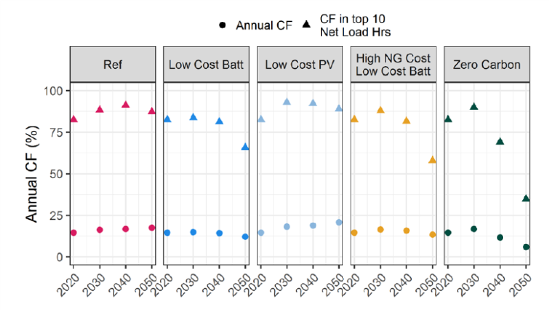 儲能系統(tǒng)在本質(zhì)上不同于大容量電力系統(tǒng)上的大多數(shù)發(fā)電設(shè)施,因為它在技術(shù)上不是一種發(fā)電資源。為了向電力系統(tǒng)提供電力,儲能系統(tǒng)必須首先存儲能量,并且由于電源轉(zhuǎn)換而導(dǎo)致效率損失。由于需要充電和相關(guān)的效率損失,容量系數(shù)圖用點來表示每種場景中存儲的平均年容量系數(shù)。在所有年份和場景中,年容量系數(shù)都保持在25%以下(在某些情況下低于10%)。為了理解圖3中的容量系數(shù)趨勢,首先考慮在擴(kuò)容模型中部署儲能系統(tǒng)的原因,其中包括: