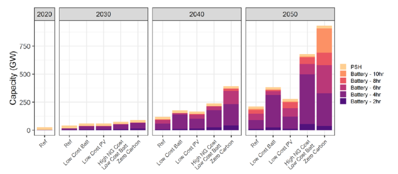 在分析的第一步中,使用區(qū)域能源部署系統(tǒng)(ReEDS)來確定在技術(shù)成本和性能的各種演變下輸電和發(fā)電資產(chǎn)的最低成本投資集。區(qū)域能源部署系統(tǒng)(ReEDS)用于長期的電力系統(tǒng)規(guī)劃工作,因為它綜合了電力部門變革和投資的許多不同限制和驅(qū)動因素,其中包括技術(shù)和燃料價格、政策和法規(guī)、技術(shù)性能限制、燃料供應(yīng)限制、以及負(fù)載形狀和總需求的變化,以確定投資路徑。第二步,是使用PLEXOS來模擬從目前到2050年(在給定場景下)預(yù)計儲能系統(tǒng)的每小時的時間尺度來運(yùn)行。PLEXOS的結(jié)果可用于評估未來預(yù)計儲能系統(tǒng)的供需沒有遇到任何重大挑戰(zhàn)。