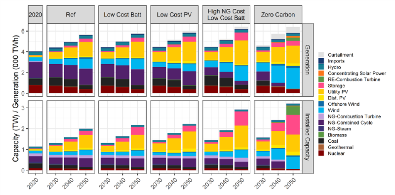 研究報告的分析重點關(guān)注區(qū)域能源部署系統(tǒng)(ReEDS)中實施的以下五個關(guān)鍵場景: