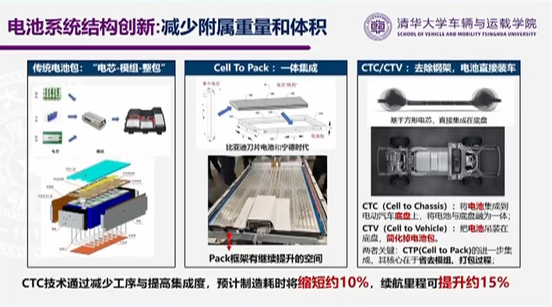 最后,關(guān)于電池系統(tǒng)結(jié)構(gòu)創(chuàng)新,他認(rèn)為主要以減少附屬重量和體積為發(fā)展方向。目前已從傳統(tǒng)“電芯-模組-整包”電池結(jié)構(gòu),轉(zhuǎn)為一體集成式Cell To Pack(CTP),各企業(yè)現(xiàn)正積極探索CTC(Cell to Chassis)及CTV(Cell to Vehicle),進(jìn)一步省去模組、打包過程,制造耗時(shí)縮短,續(xù)航里程再提升。