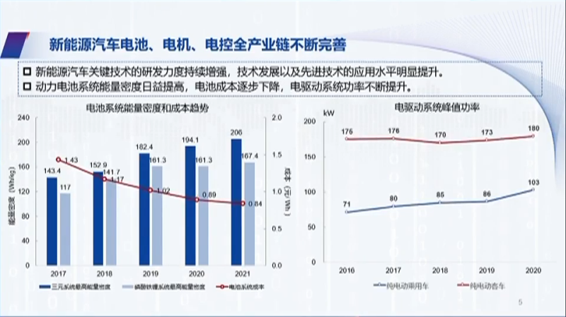 以動(dòng)力電池系統(tǒng)為例,據(jù)全國(guó)政協(xié)經(jīng)濟(jì)委員會(huì)副主任 苗圩展示數(shù)據(jù)來看,在2017-2021年五年中,三元電池系統(tǒng)的能量密度從143Wh/kg提升至206Wh/kg,磷酸鐵鋰電池的能量密度從117Wh/kg提高到167.4Wh/kg。電池成本也同樣在逐步下降,已從2017年的1.43元/ Wh降至2021年的0.84元/ Wh。